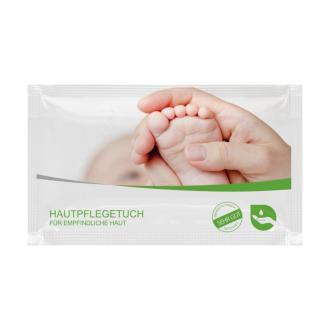 Feuchtes Erfrischungs-, Hautpflege und Reinigungstuch ohne Alkohol, bestes für empfindliche Haut geeignet und dermatologisch als "Sehr Gut" bewertet.
